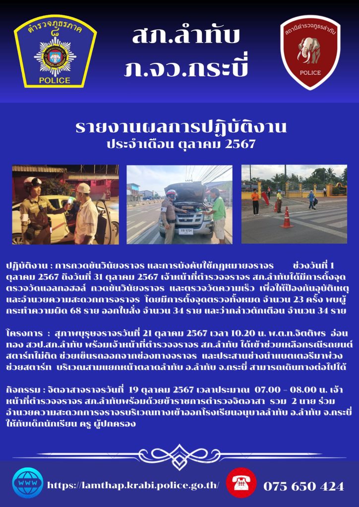Home » การดำเนินงานของสถานีตำรวจ » ผลการปฏิบัติงานจราจร ประจำเดือน ต.ค.67